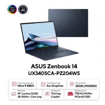 Laptop Asus Zenbook 14 UX3405CA-PZ204WS (Ultra 9 285H/ 32GB/ 1TB SSD/ 14 inch 3K Touch/ 120Hz/ Win 11/ Office/ Blue/ Vỏ nhôm/ Bút/ Túi)