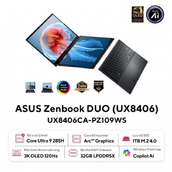 Laptop Asus Zenbook Duo UX8406CA-PZ109WS (Ultra 9 285H/ 32GB/ 1TB SSD/ 14 inch 3K Touch/ 120Hz/ Win 11/ Office/ Gray/ Vỏ nhôm/ Bút/ Túi)
